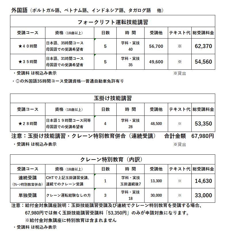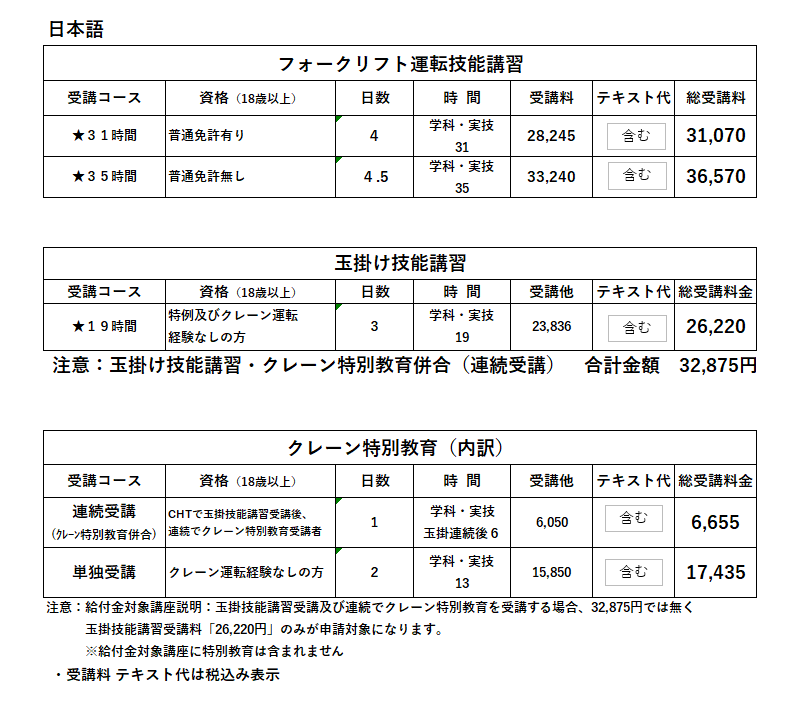 フォークリフト運転技能講習、玉掛け技能講習、玉掛け技能講習・クレーン特別教育併合講習